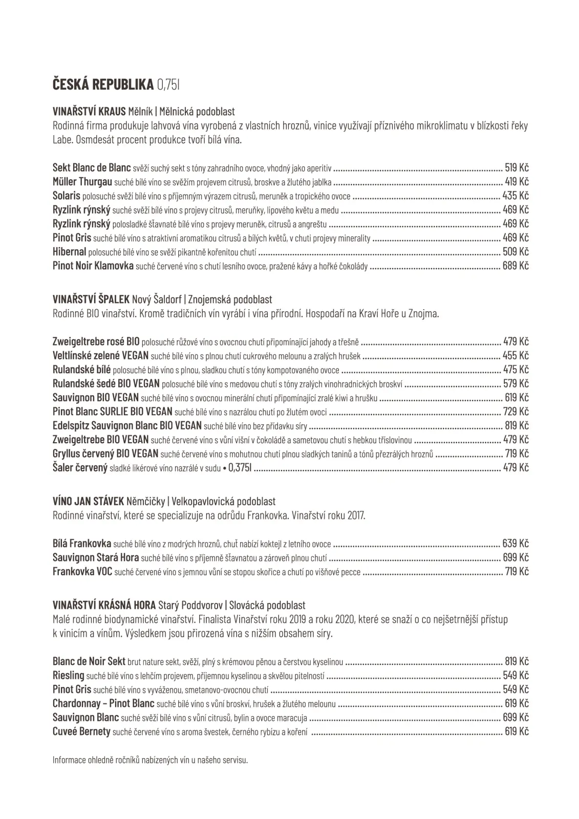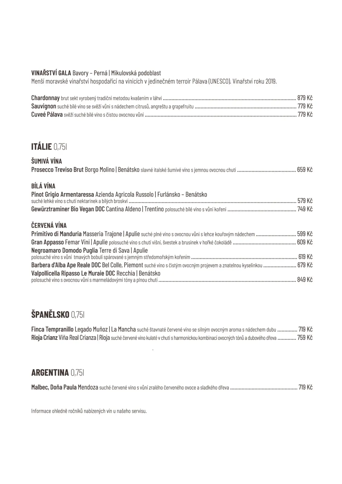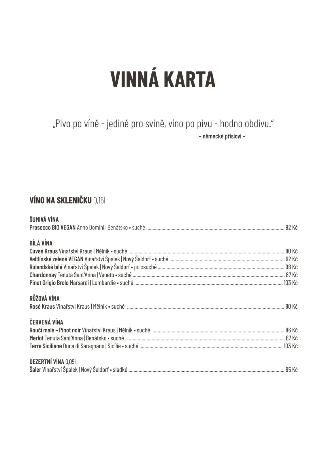Na naší vinné kartě najdete i vína z Vinařství Kraus z Mělníka či Vinařství Jan Stávek z Němčiček, ale i úžasná vína z Itálie nebo Španělska. Každá sklenka tak přináší nezapomenutelný vinný zážitek.