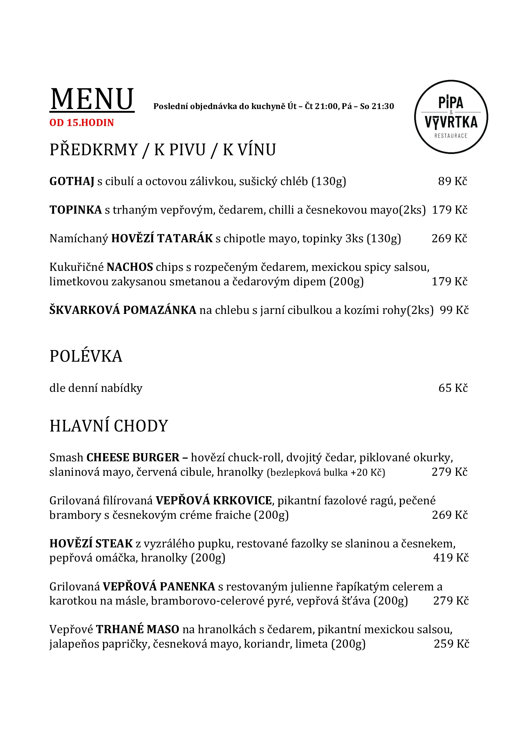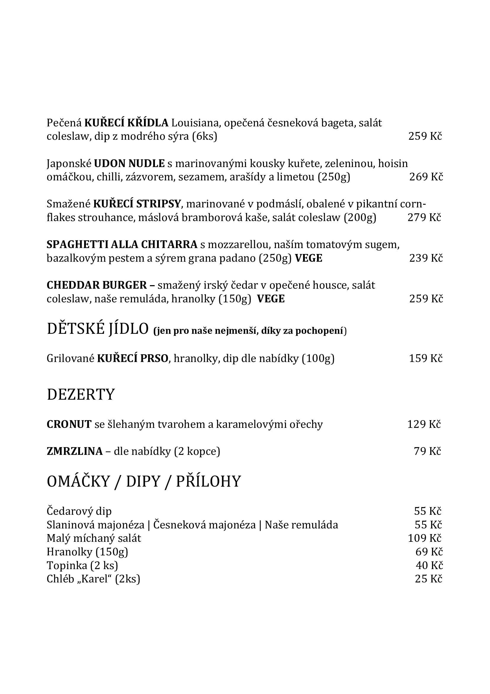 Ke skvělému pivu patří dobré a čerstvé jídlo. Nabízíme poctivou kuchyni, která si na nic nehraje, jen skvěle chutná. Ideální k pivu, vínu i jen tak na hlad.